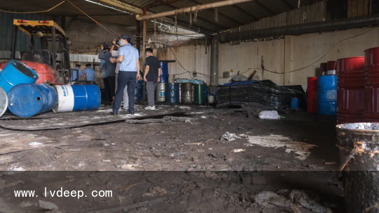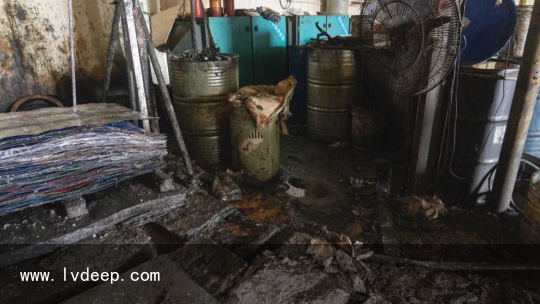 「現場用于壓平桶身的平整機 」 處置懲罰過程中工人任由廢鐵桶里面的殘留物流出地面滿是黏糊糊的不明物質車間內彌漫著刺鼻的氣味可見現場揮發性有機化合物氣體 的濃度十分高在切割過程中極易發生爆炸